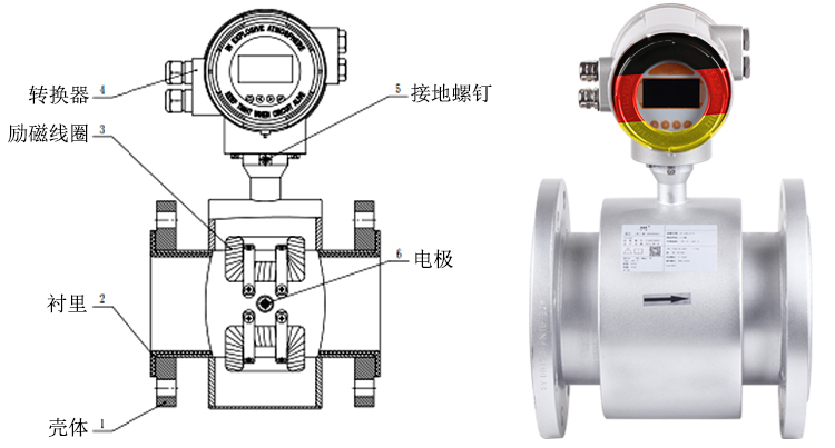 電磁流量計測量原理是基于法拉第電磁感應定律。流量計的測量管是一內(nèi)襯絕緣材料的非導磁合金短管。兩只電極沿管徑方向穿通管壁固定在測量管上。其電極頭與襯里內(nèi)表面基本齊平。勵磁線圈由雙向方波脈沖勵磁時,將在與測量管軸線垂直的方向上產(chǎn)生一磁通量密度為B的工作磁場。此時,如果具有一定電導率的流體流經(jīng)測量管,將切割磁力線感應出電動勢E。電動勢E正比于磁通量密度B、測量管內(nèi)徑d與平均流速V的乘積,電動勢E(流量信號)由電極檢出并通過電纜送至轉(zhuǎn)換器。轉(zhuǎn)換器將流量信號放大處理后,可顯示流體流量,并能輸出脈沖,摸擬電流等信號,用于流量的控制和調(diào)節(jié)。